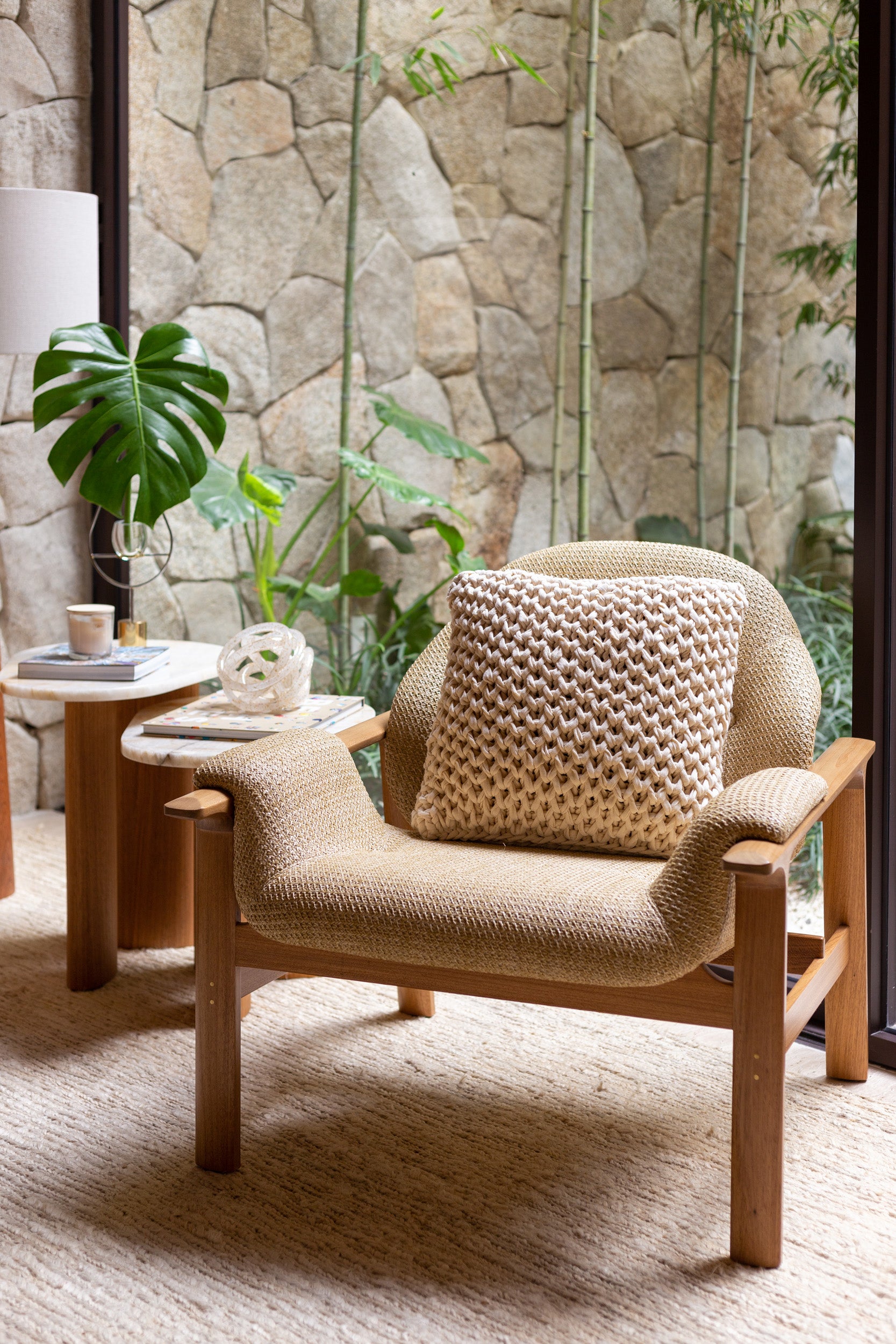 Almofada em tricô artesanal frente e verso, com fio 100% algodão.