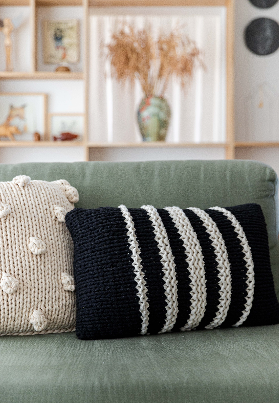 Almofada em tricô artesanal frente e verso, com fio 100% algodão.