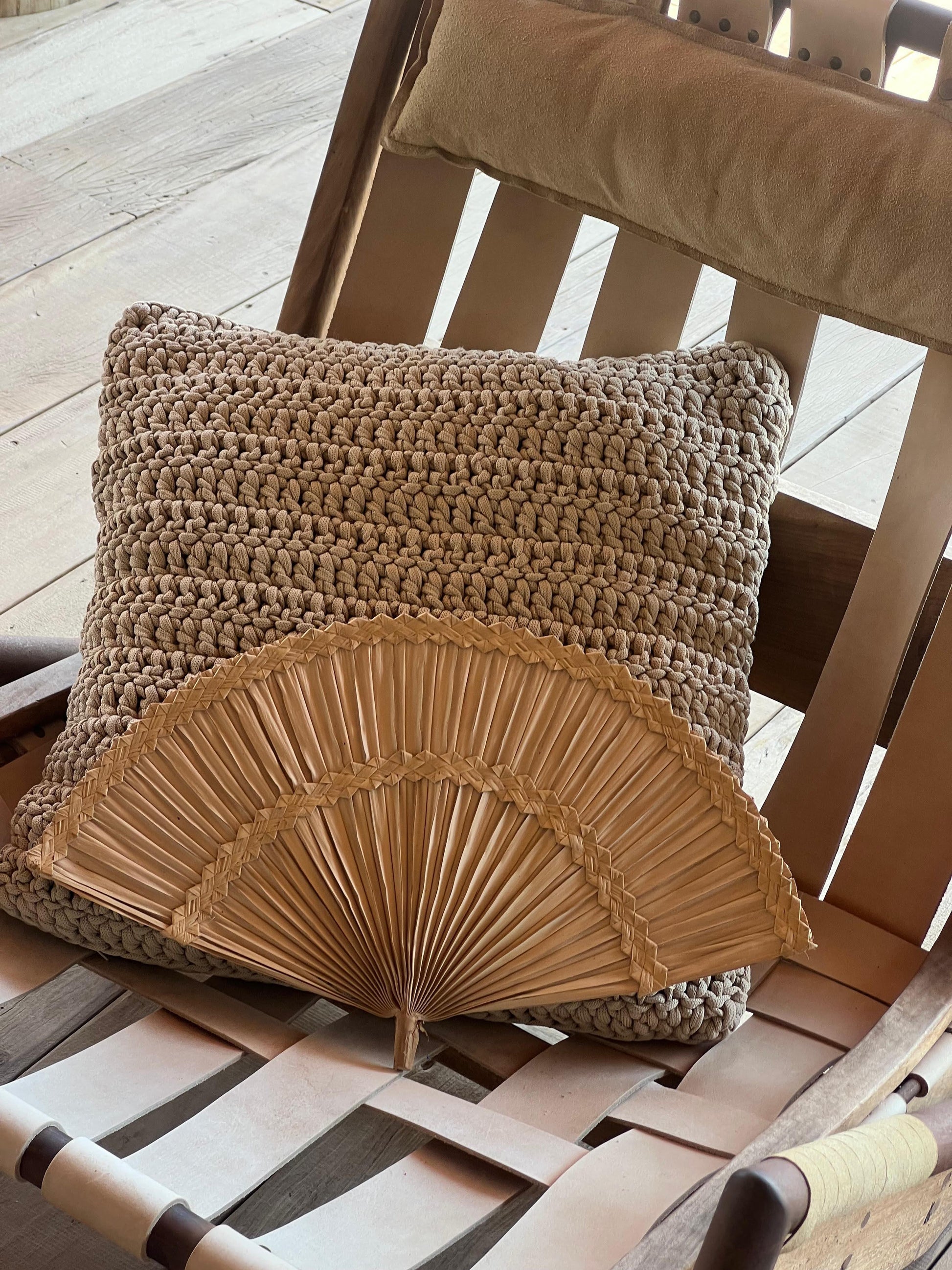 Almofada em crochê artesanal frente e verso, com fio náutico 100% polipropileno, resistente à água e proteção UV.