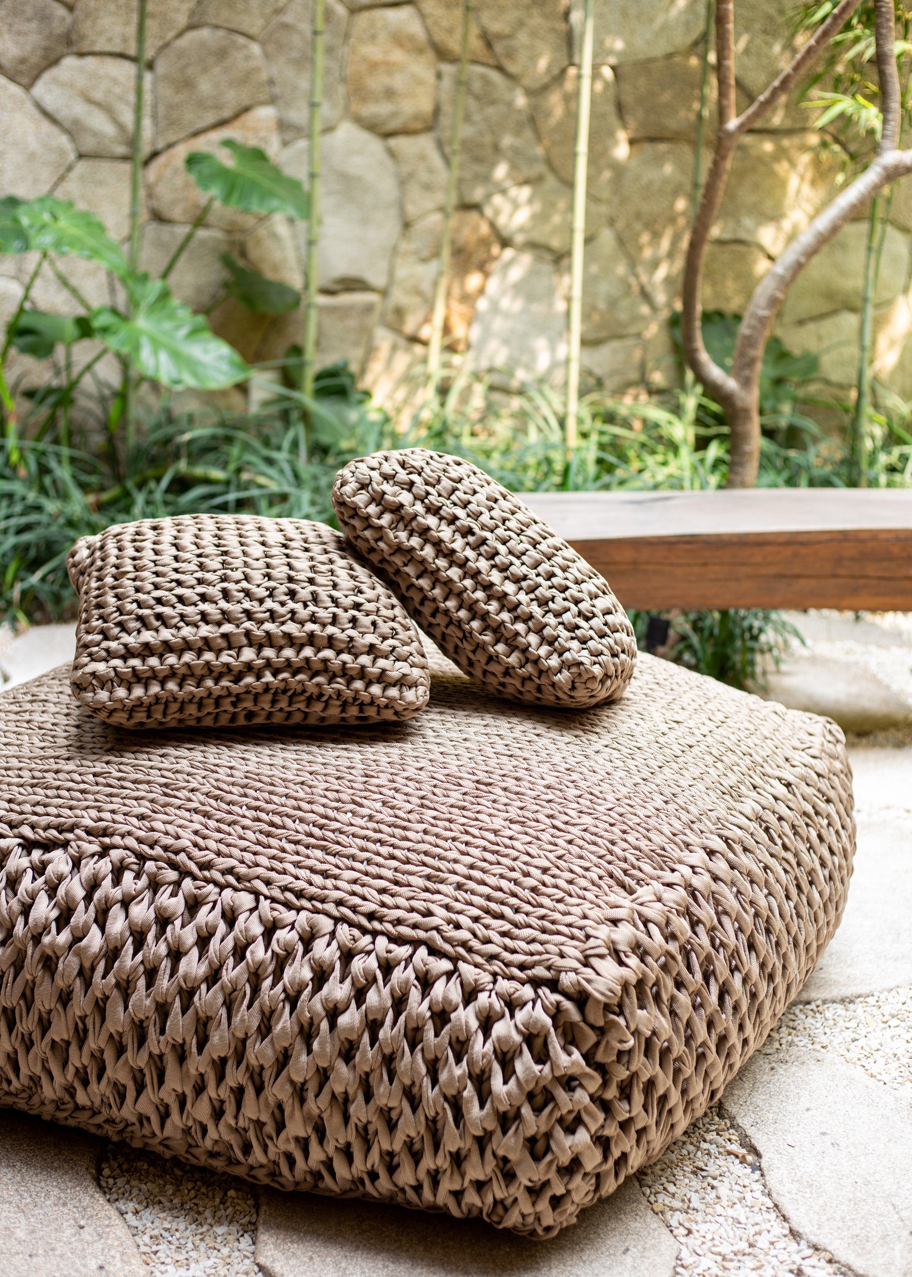 Almofada em tricô artesanal frente e verso, com fio náutico 100% polipropileno, resistente à água e proteção UV.