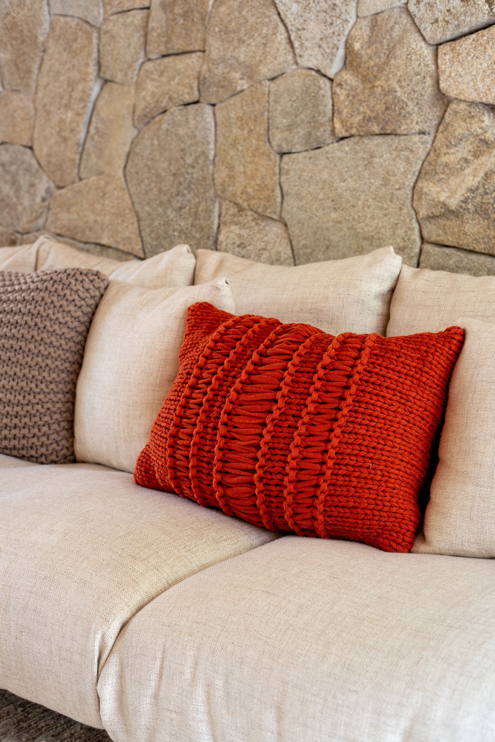 Almofada em tricô artesanal frente e verso, com fio 100% algodão.