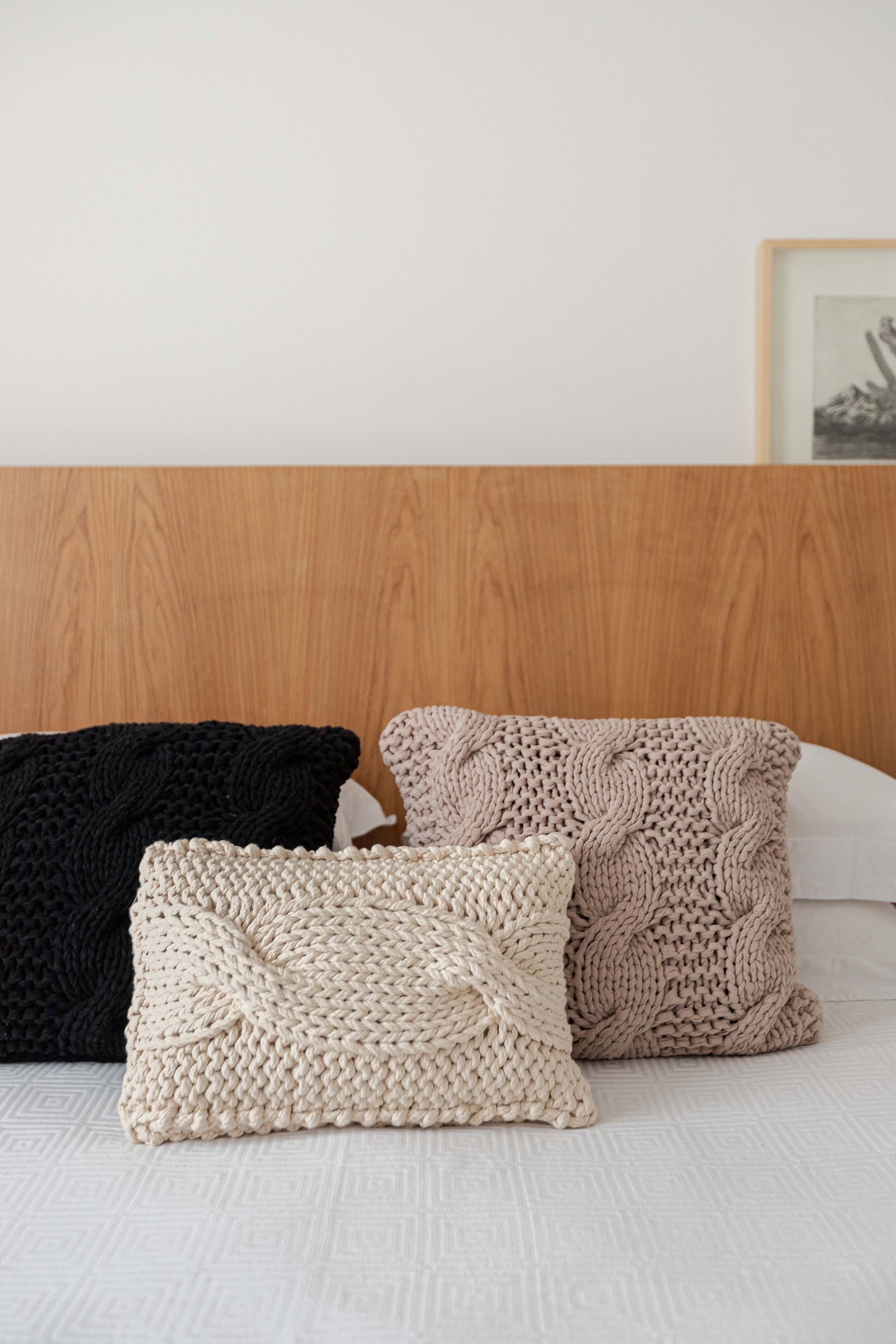 Almofada em tricô artesanal frente e verso, com fio 100% algodão.