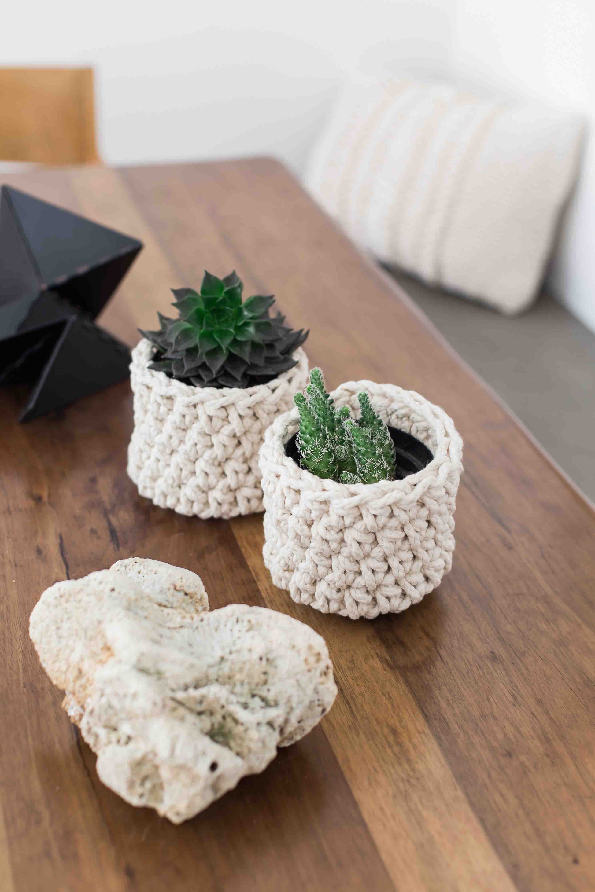 Cachepot em crochê artesanal e macramê, com fio 100% algodão.