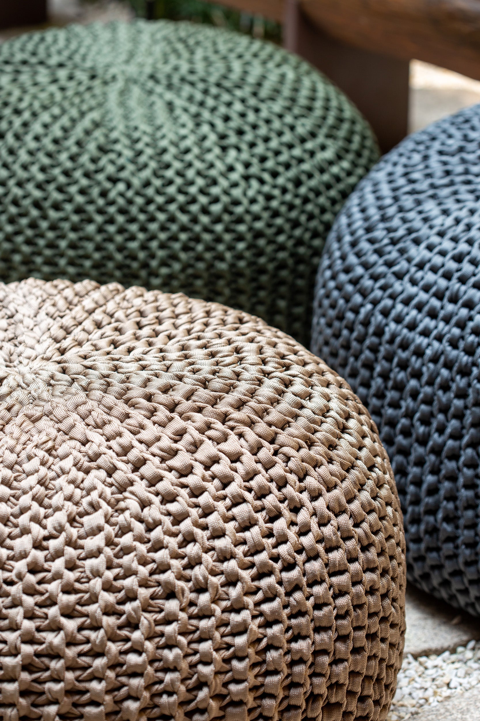 Puff em tricô artesanal com fio náutico 100% polipropileno, material com alta resistência, durabilidade e proteção UV.